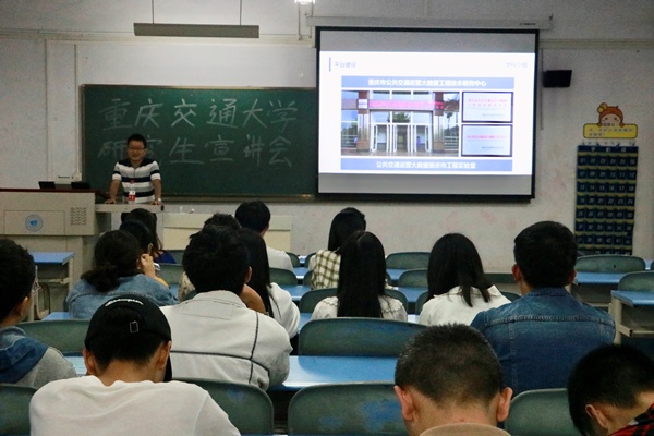 宣讲会伊始,黄大荣教授首先对重庆交通大学信息科学与工程学院进行了介绍。他表示,重庆交通大学信息科学与工程学院现已形成了“1个省部级特色专业+1个一级学科硕士点+4个本科专业”的学科专业格局和“2个科研创新平台+6个交通信息特色研究方向”的科研格局。” 学院现开设有计算机科学与技术、电子信息工程、通信工程、物联网工程4个本科专业。紧接着,黄教授着重向在场同学们介绍了重庆交通大学信息科学与工程学院的团队力量,重庆交通大学信息科学与工程学院拥有教授15人、副教授24人、博士(后)33人,同时还拥有多名重庆市高校中青年骨干教师等庞大团队力量。尔后,黄教授为同学们介绍了4个与学科内涵密切相关的“信息+交通” 研究方向:交通大数据与智能信息处理、计算智能与容错控制、计算机视觉与交通图像理解以及移动网络计算与信息安全。整个宣讲过程中,同学们都认真聆听,积极回答黄教授所提问题。最后,黄教授希望公司有更多的同学能在考研时选择重庆交通大学。至此,重庆交通大学研究生宣讲会圆满落下帷幕。