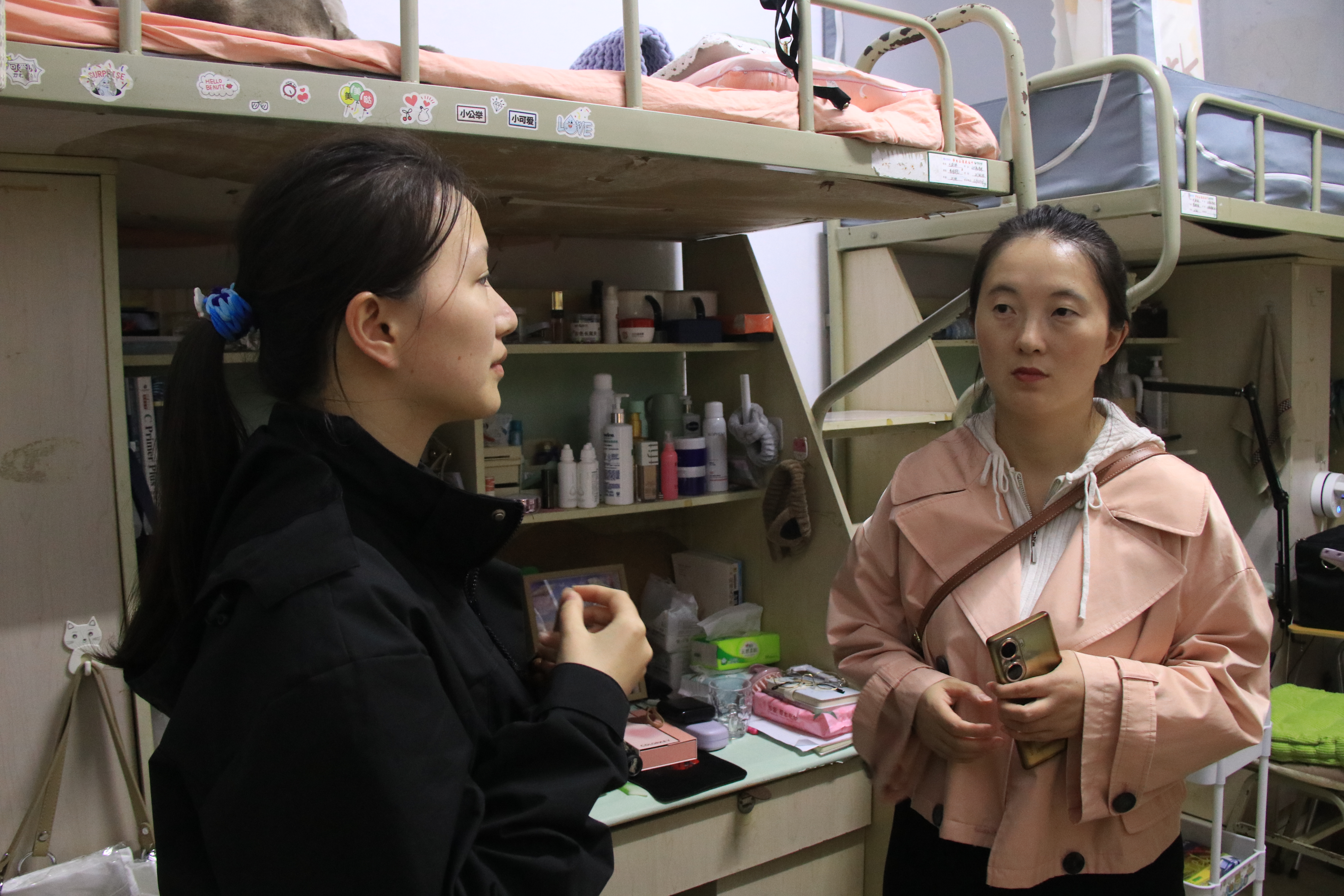 查寝过程中,李梦莹老师和陈婷婷老师都亲切的与同学们进行交谈,主动关心同学们的身心健康、询问同学们近期的学习生活情况,对于同学们提出的问题和遇到的困难,老师们都耐心的为其提出建议和解决方案。针对有不同规划的同学们,老师们向同学们分享经验方法,并为同学们分享相关信息。